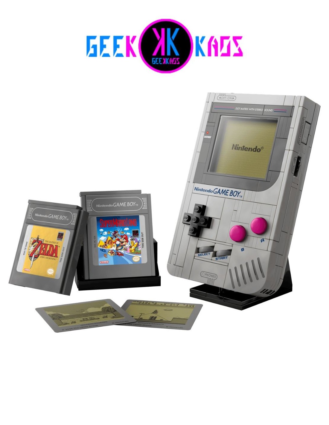 Personaliza tu creación con los cartuchos Game Pak para Game Boy construibles e intercambiables de The Legend of Zelda™: Link’s Awakening o Super Mario Land™, y con las correspondientes pantallas lenticulares (o una pantalla de inicio de Nintendo). Para terminar, coloca tu nostálgica creación en la base de exposición construible.